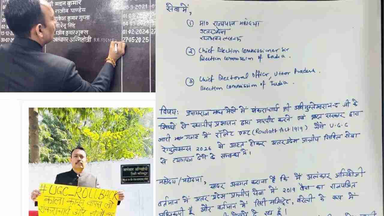 राज्यपाल को भेजा इस्तीफा : उन्होंने राज्यपाल को भेजे इस्तीफे में लिखा है, मैं अलंकार अग्निहोत्री, City Magistrate, बरेली, UGC Regulations 2026 के विरोध एवं प्रयागराज में माघ मेले में ज्योर्तिमठ के शंकराचार्य अविमुक्तेश्वरानंद महाराज के ब्राह्मण बटुक शिष्यों की चोटी/शिखा पकड़ कर हुई मारपीट के विरोध में तत्काल प्रभाव से अपने पद से इस्तीफा दे रहा हूं.