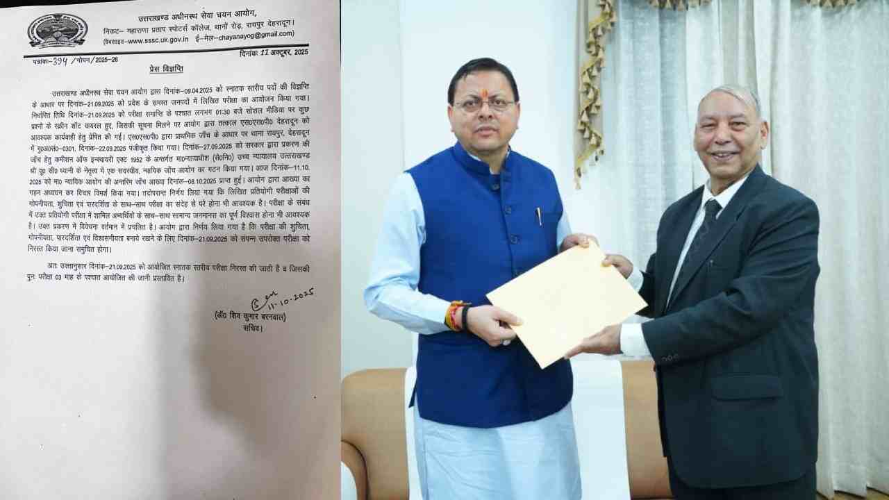 देहरादून: उत्तराखंड अधीनस्थ सेवा चयन आयोग की स्नातक स्तरीय परीक्षा को रद्द करने का बड़ा फैसला लिया गया है। तीन महीने के भीतर दोबारा परीक्षा कराई जाएगी।