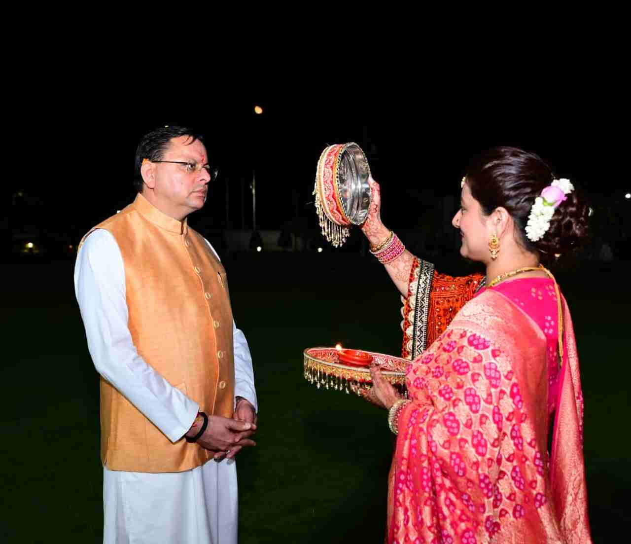 देहरादून: मुख्यमंत्री पुष्कर सिंह धामी ने आज मुख्यमंत्री आवास में अपनी धर्मपत्नी श्रीमती गीता धामी के साथ करवा चौथ का व्रत पारंपरिक श्रद्धा एवं उत्साह