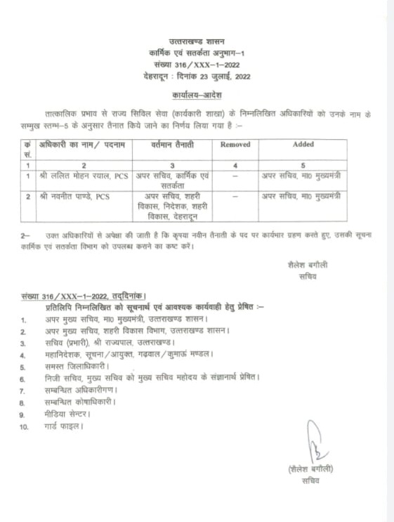 देहरादून: उत्तराखंड मे 2 पीसीएस अधिकारियों को शासन ने दी बड़ी जिम्मेदारी है पीसीएस अधिकारी ललित मोहन रयाल को अपर सचिव मुख्यमंत्री की जिम्मेदारी और